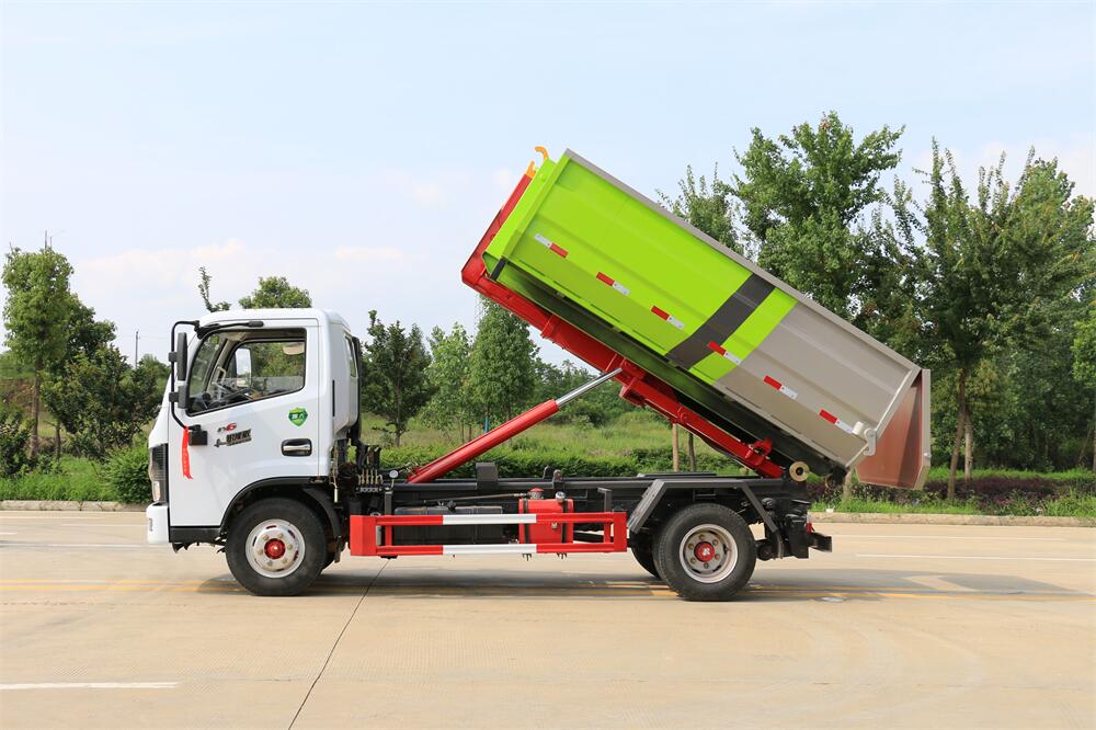 該款鉤臂式垃圾車由液壓系統、操作系統組成。舉升油制缸(1支)系國內知名液壓件廠家生產的雙作用油缸。垃圾廂可自吊上放下,可自行傾倒垃圾,上下一次工作循環時間≤50S。該車的特點是一個車能配多個垃圾廂,能實現一臺車與多個垃圾廂聯合作業,循環運輸,充分提高了車輛的運輸能力。