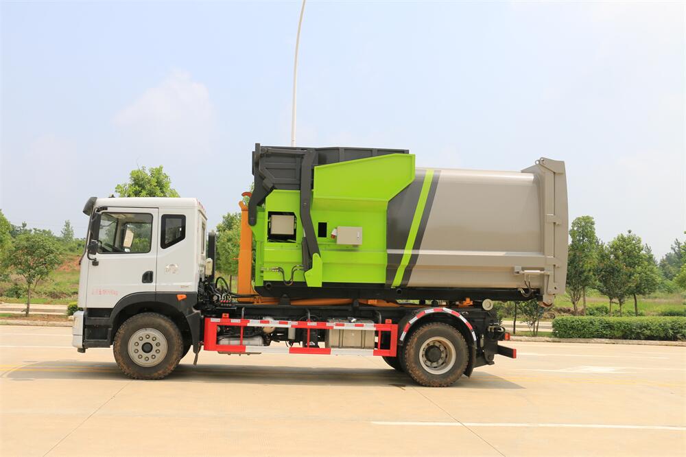 該款鉤臂式垃圾車由液壓系統、操作系統組成。舉升油制缸(1支)系國內知名液壓件廠家生產的雙作用油缸。垃圾廂可自吊上放下,可自行傾倒垃圾,上下一次工作循環時間≤50S。該車的特點是一個車能配多個垃圾廂,能實現一臺車與多個垃圾廂聯合作業,循環運輸,充分提高了車輛的運輸能力。