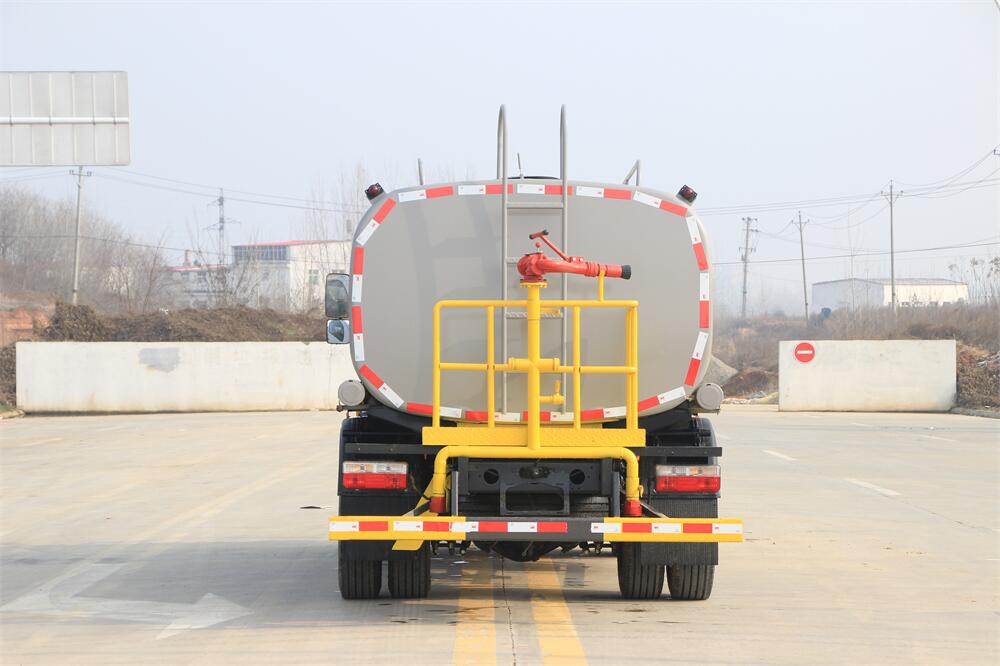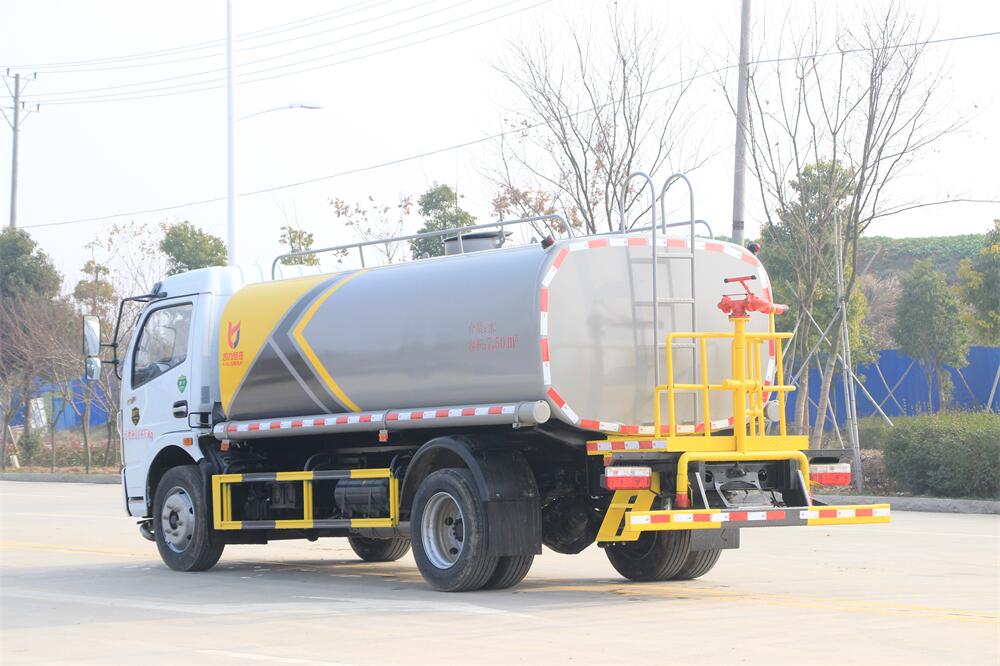 灑水車(chē)前裝有鴨形噴嘴或圓頭沖嘴,后面裝有圓柱開(kāi)灑水噴嘴或蓮蓬頭噴嘴,后部有一工作平臺(tái),裝配有水炮。后部還可裝8個(gè)噴嘴(選裝)。