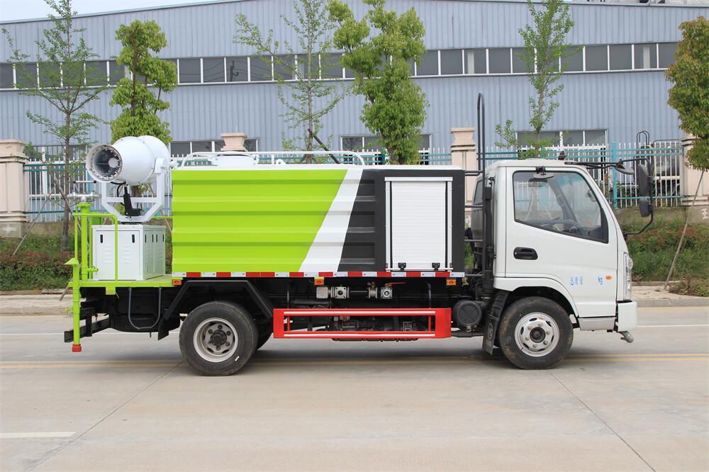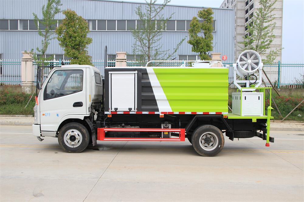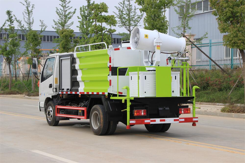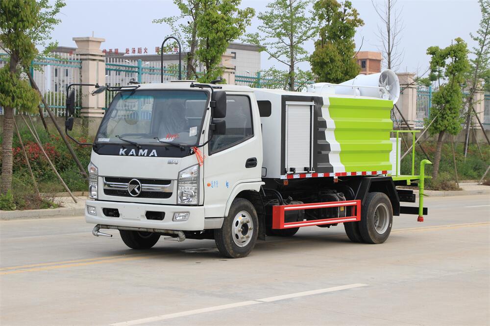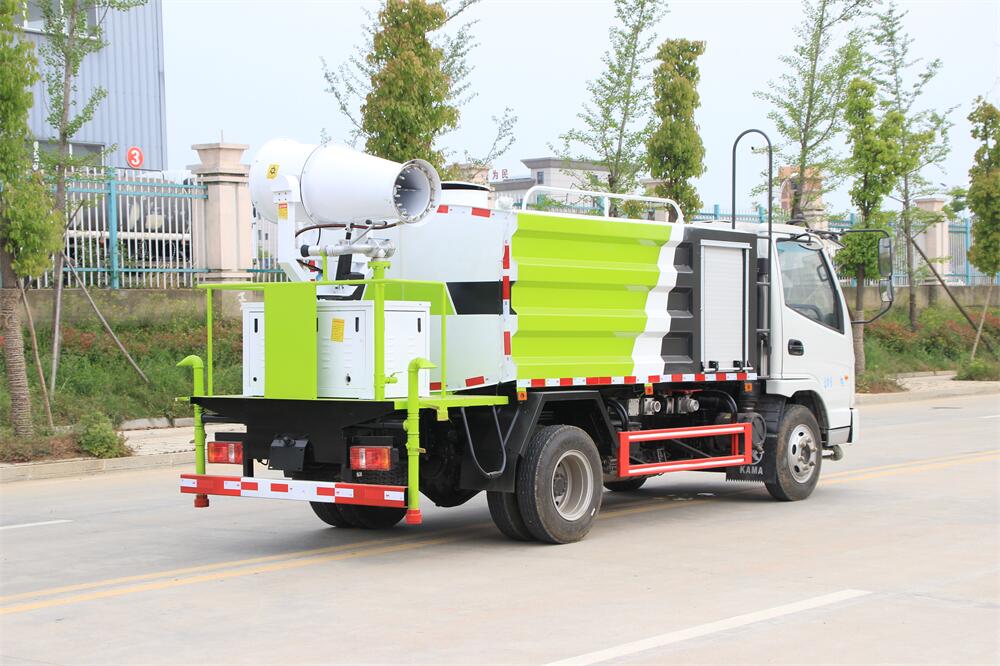 上裝配置:罐體容積為 5立方,選配風送式霧炮機組射程30米、40米、50米、60米、80米、100米、120米霧炮,罐體鋼板為4mm碳鋼Q235材質,罐內隔板具有防波作用,以減輕汽車行駛時罐體液體沖擊,罐體及整車外形尺寸按照公告。帶大功率專用灑水泵,泵可自吸自排,整車前沖、后灑、側噴、帶65消防接口,后平臺配CLW-50、CLW-60、CLW-80、CLW-100、CLW-120型風送式霧炮機組;罐體前封頭配大功率柴油發電機組;前封頭帶水位計,后平臺主管路帶1寸澆花接口,后爬梯。帶兩根輸水管及陰陽端。罐體顏色:銀/灰/綠,罐體兩側噴“多功能抑塵車”字樣,貼反光標示。